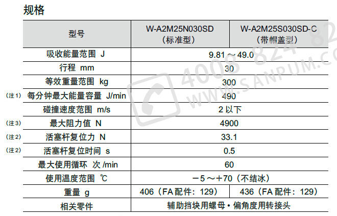 W-A2M25(30)系列重量轻、紧凑小巧的模拟调节式两级动作螺纹型缓冲器(双级动作W型,变则多节流孔/模块调节式)