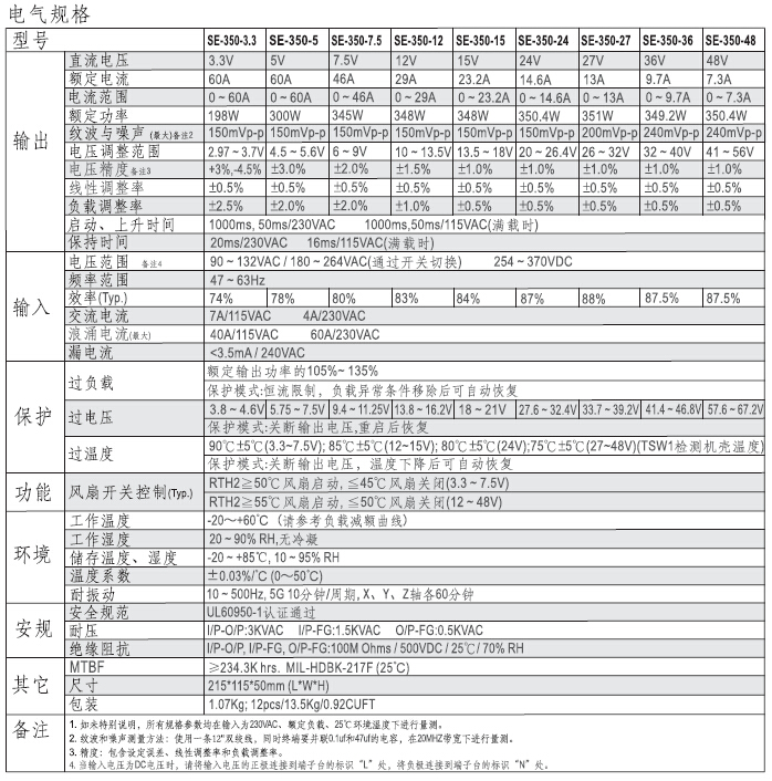 交流输入范围通过开关切换;保护种类:短路/过负载/过电压/过温度;内置直流风扇强制风冷;可承受300vac浪涌输入5秒;具有冷却风扇开关控制;具有恒流限制电路;100%满载老化测试;LED电源指示;开关工作频率:90KHZ;低成本,高可靠度;2年保固。