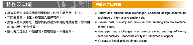 采用密闭型设计,内外空气不产生对流;可阻隔湿气、油气、粉尘进入电控箱内;节约能源且效率高的传热导体,约为铜的1600倍,安全性高;简化轻巧之设计不佔空间,安装容易,保养简单。