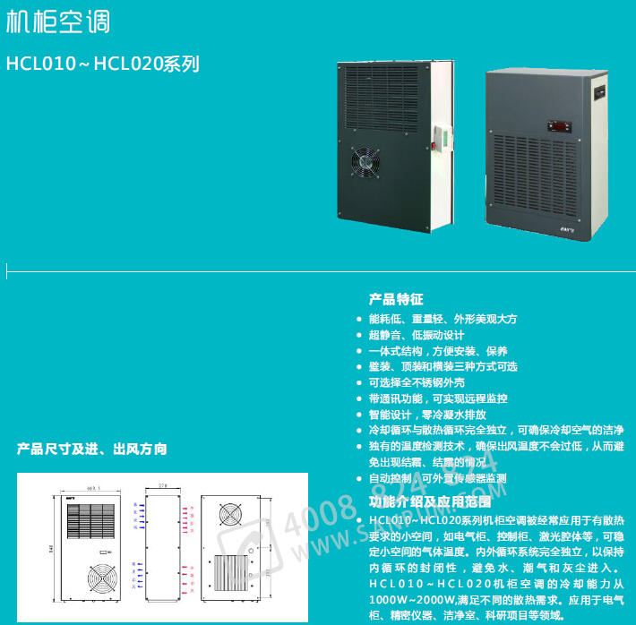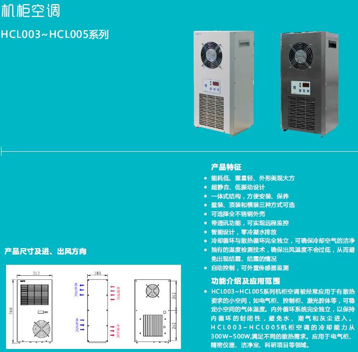 能耗低、重量轻、外形美观大方;超静音、低振动设计;一体式结构,壁装、顶装和横装三种方式可选;可选择全不锈钢外壳;带通讯功能,可实现远程监控;智能设计,零冷凝水排放;冷却循环与散热循环完全独立,可确保冷却空气的洁净;独有的温度检测技术,确保出风温度不会过低,从而避免出现结霜、结露的情况;自动控制,可外置传感器监测.