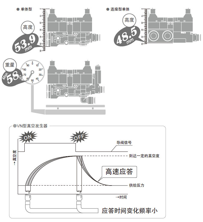 很好地应用于IC芯片吸取,移动的半导体设备上; 尺寸精小,重量轻,满足于设计精密设备的需要高速运转并且应答稳定(开/关最多5毫秒)主阀体为直动式电磁阀