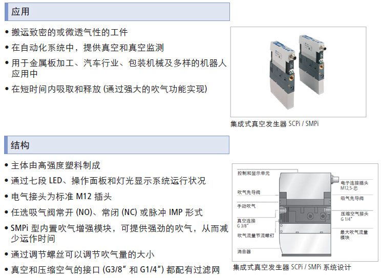 搬运致密的或微透气性的工件;在自动化系统中,提供真空和真空监测;用于金属板加工、汽车行业、包装机械及多样的机器人应用中;可在短时间内吸取和释放(通过强大的吹气功能实现).