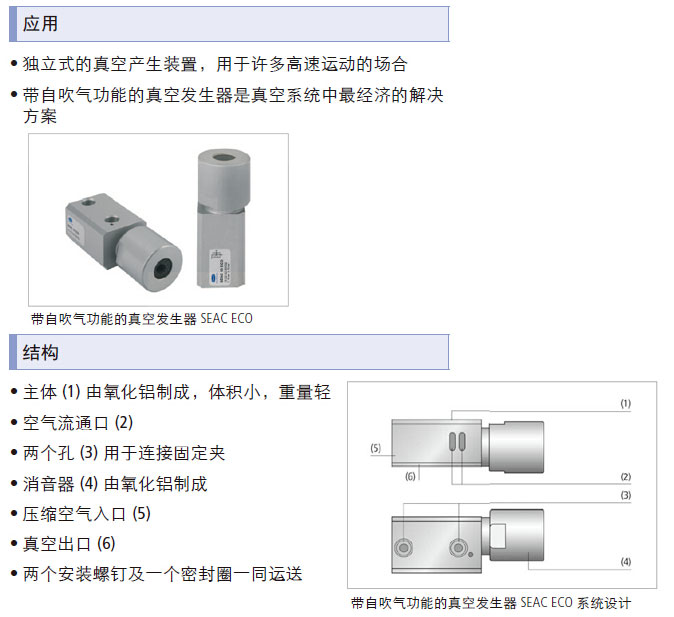 独立式的真空产生装置,用于许多高速运动的场合; 带自吹气功能的真空发生器是真空系统中最经济的解决方案.