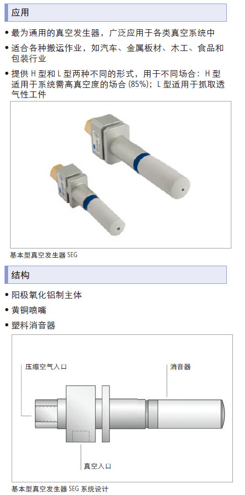 无运动部件,寿命长、免维护; 效率极高,最小耗气量产生最大吸气容量; 广泛应用于各类真空系统中适合各种搬运作业,如汽车、金属板材、木工、食品和包装行业.