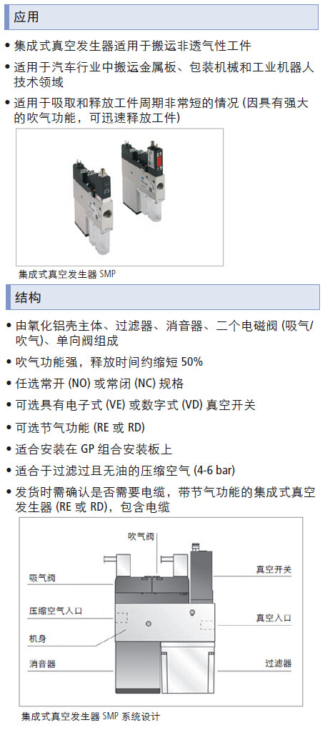 多样的模块化结构,灵活满足客户需求; 各种不同的吸气流量,满足各种作业要求; 适用于吸取和释放工件周期非常短的情况(因具有强大的吹气功能,可迅速释放工件)