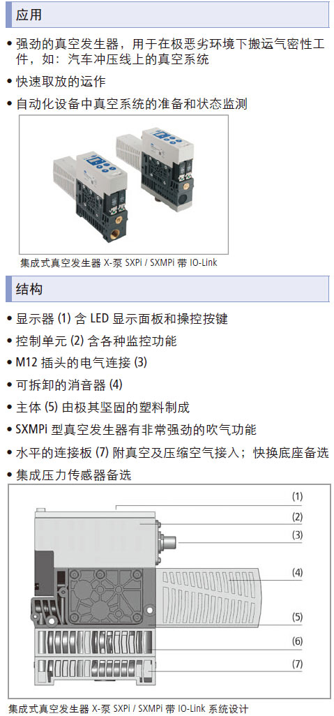 强劲的真空发生器,用于在极恶劣环境下搬运气密性工件(如:汽车冲压线上的真空系统); 快速取放的运作; 自动化设备中真空系统的准备和状态监测.