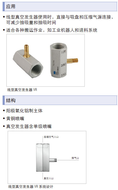 使用时,直接与吸盘和压缩气源连接,可减少抽吸量和抽吸时间; 适合各种搬运作业,如工业机器人和进料系统