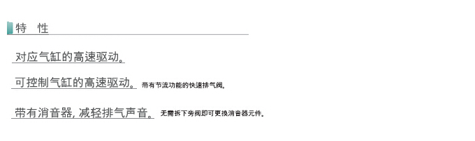 对应气缸的高速驱动,可控制气缸的高速驱动;带有节流功能的快速排气阀;带有消音器,减轻排气声音;无需拆下旁阀即可更换消音器元件。