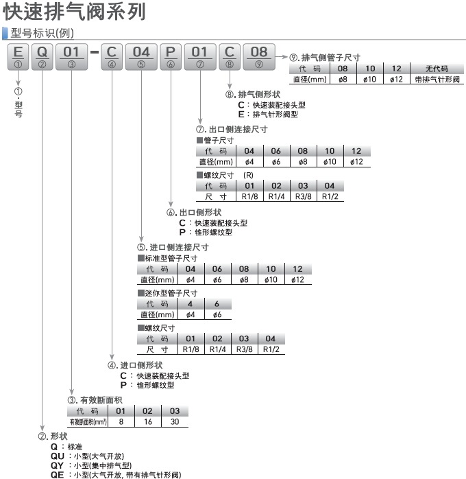 对应气缸的高速驱动,可控制气缸的高速驱动;带有节流功能的快速排气阀;带有消音器,减轻排气声音;无需拆下旁阀即可更换消音器元件。