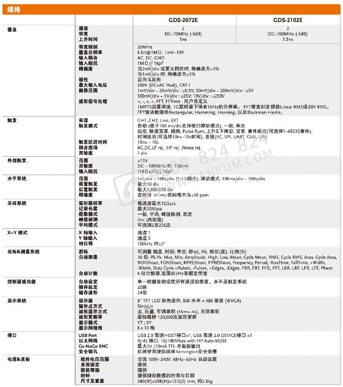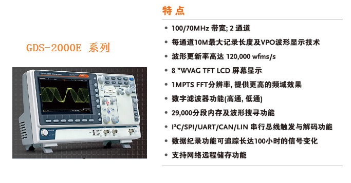 1MPTS FFT分辨率,提供更高的频域效果;有数字滤波器功能(高通,低通)及29,000分段内存及波形搜寻功能;I2/SPI/UART/CAN/LIN串行总线触发与解码功能;支持网络远程储存功能。