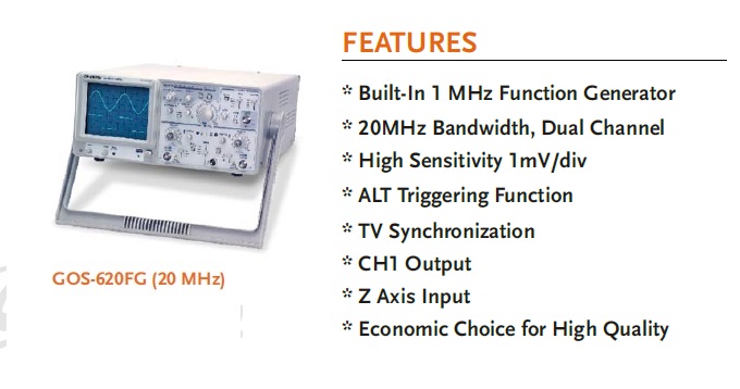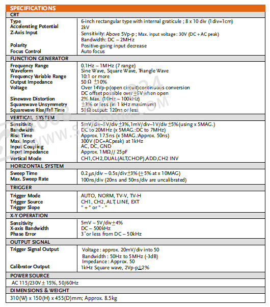 20MHz带宽,双通道;高灵敏度为1mV/div;电视同步,Z轴输入;ALT触发功能 保持关闭功能,CHI输出,高品质。