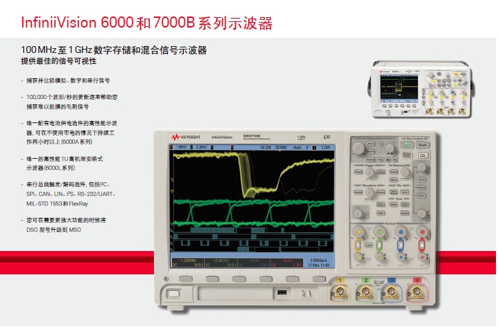 100 MHz至1 GHz数字存储和混合信号示波器;捕获并比较模拟、数字和串行信号;100,000个波形/秒的更新速率;串行总线触发/解码选件,包括l2C、SPI、CAN、LIN、l2S、RS-232/UART、 MIL-STD 1553 和 FlexRay。
