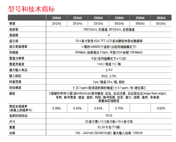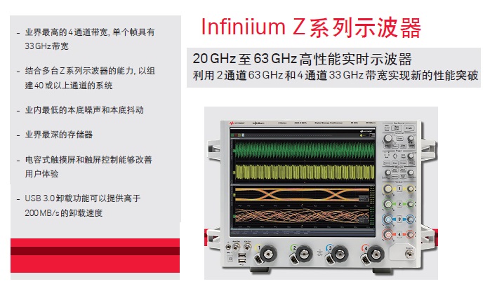 20GHz至63GHz高性能实时示波器;业内最低的本底噪声和本底抖动、最深的存储器;USB 3.0卸载功能可以提供高于200 MB/s的卸载速度。