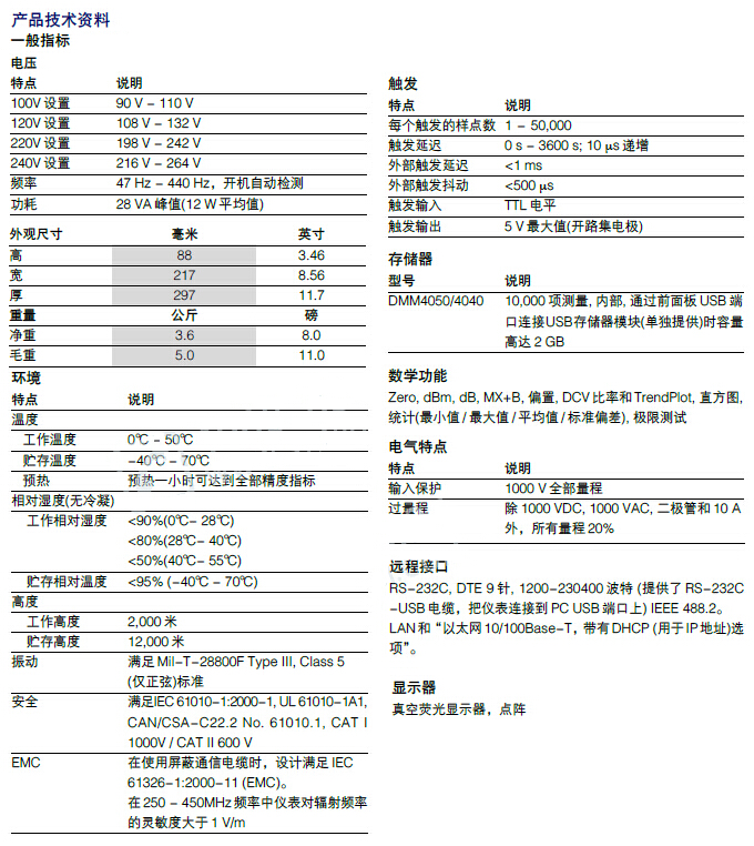 6.5位分辨率;高达0.0024%的基本VDC准确度(1年);100mV- 1000V电压量程,高达100nV分辨率;100μA一10A电流量程,高达100pA分辨率;10Ω -1GΩ电阻量程,高达10μΩ分辨率;CAT I 1000V, CAT II 600V;电压、电阻和电流测量 ;二极管和通断测试;频率和周期测量;2 x 4欧姆4线测量技术;TrendPlot™无纸化数据记录器模式;测量统计。
