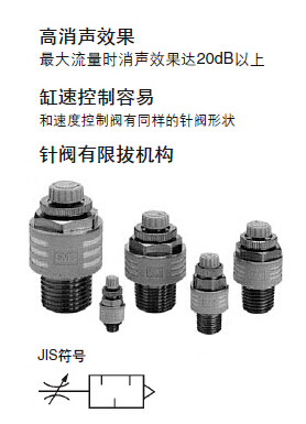高消声效果,最大流量时消声效果达20dB以上;缸速控制容易,和速度控制阀有同样的针阀形状;针阀有限拔机构。