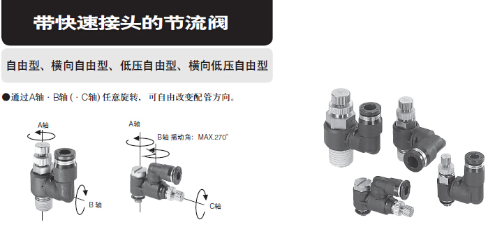自由型、横向自由型、低压自由型、横向低压自由型;通过A轴,B轴,C轴,任意旋转,可自由改变配管方向。