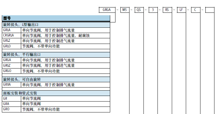 单向节流阀,用于控制进气和排气流量。节流阀,不带单向功能。适用于螺纹M3...G3/4和气管外径3...12mm;工程塑料盒金属结构,不含铜和聚四氟乙烯,耐腐蚀结构。