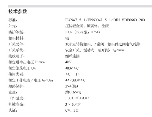 压铸轻金属,镀黄铬,涂漆、双断点转换触头,2常闭,触头件之间电气绝缘,可靠性高; 符合矿山,采石,林业,发电运输机械设备的严格安全要求;