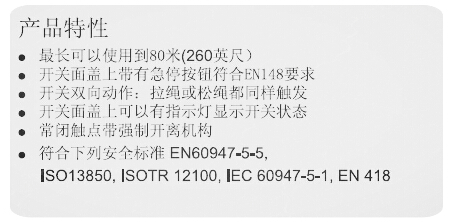 最长可以使用到80m,开关面盖上带有急停按钮,符合EN148要求; 开关双向动作:拉绳或松绳都同样触发,开关面上盖可以有指示灯显示开关状态,常闭触点带强制开离机构;