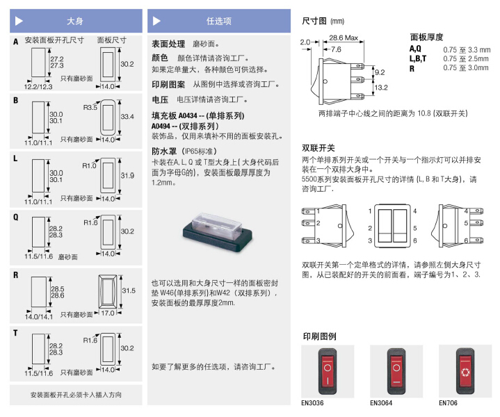带灯,多种切换电路,多种面板式样,多种面板开孔尺寸; 可提供指示灯版,单排系列,防水罩任选;
