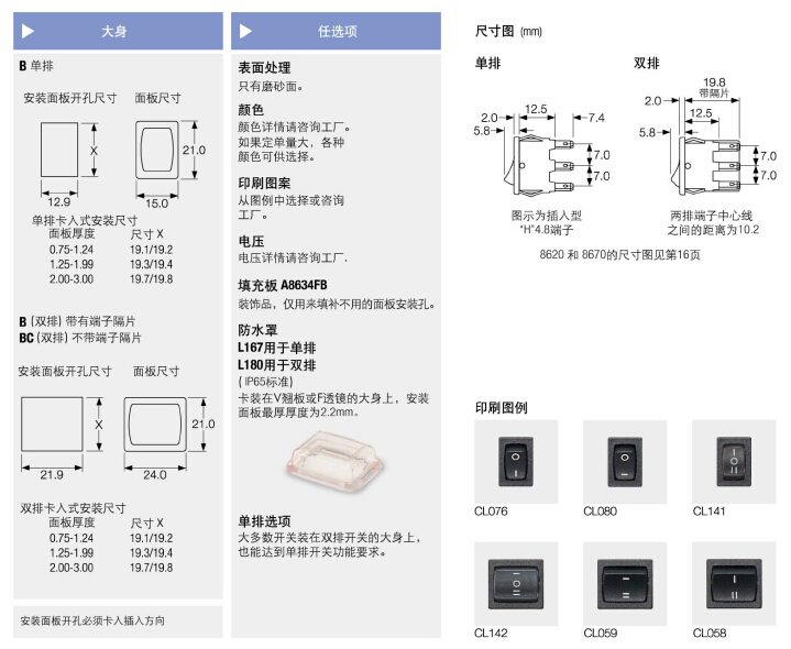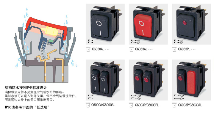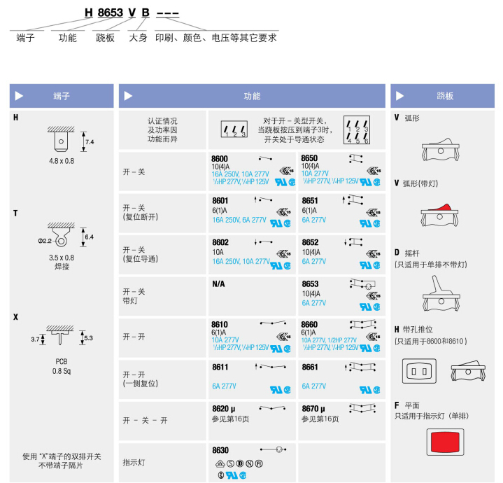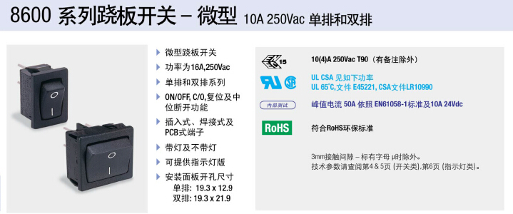 单排和双排,ON/OFF,C/0,复位及中位断开功能; 插入式、焊接式及PCB式端子; 带灯及不带灯,可提供指示灯版;