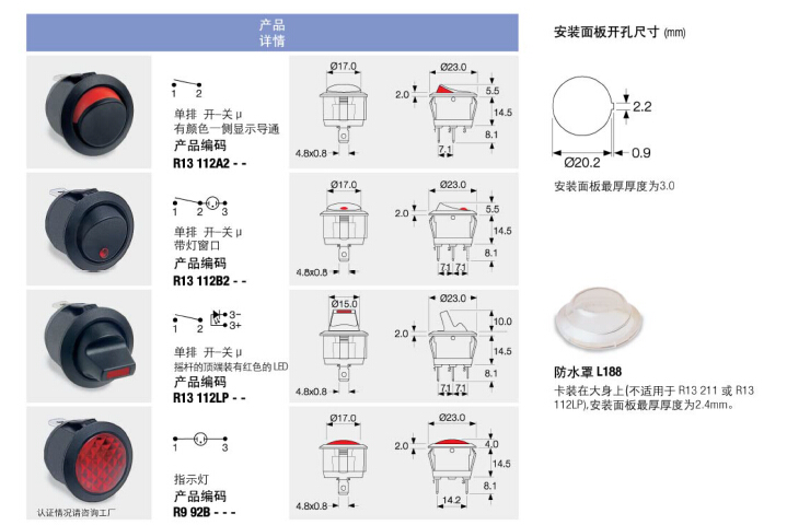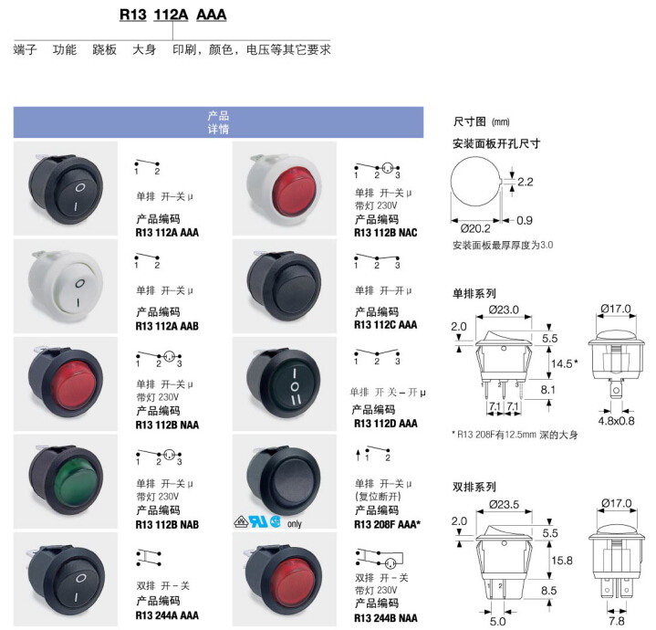 微型,单排和双排,带灯及不带灯,氖灯和二极管,多种推位,可提供指示灯版;