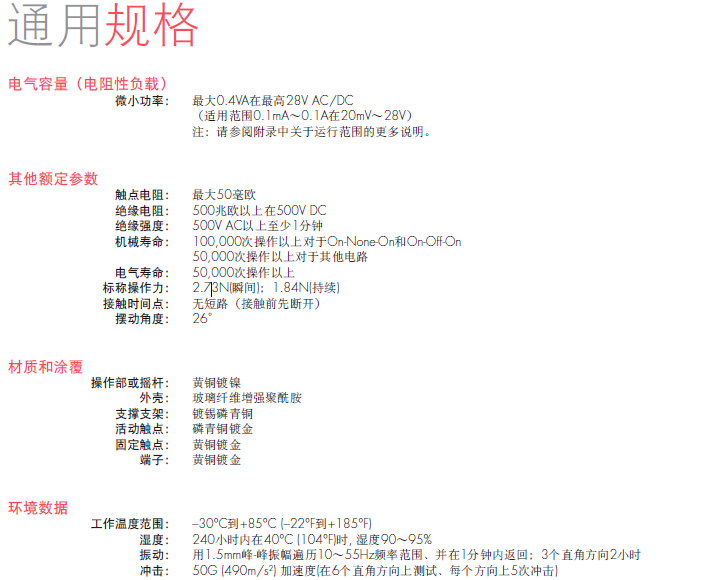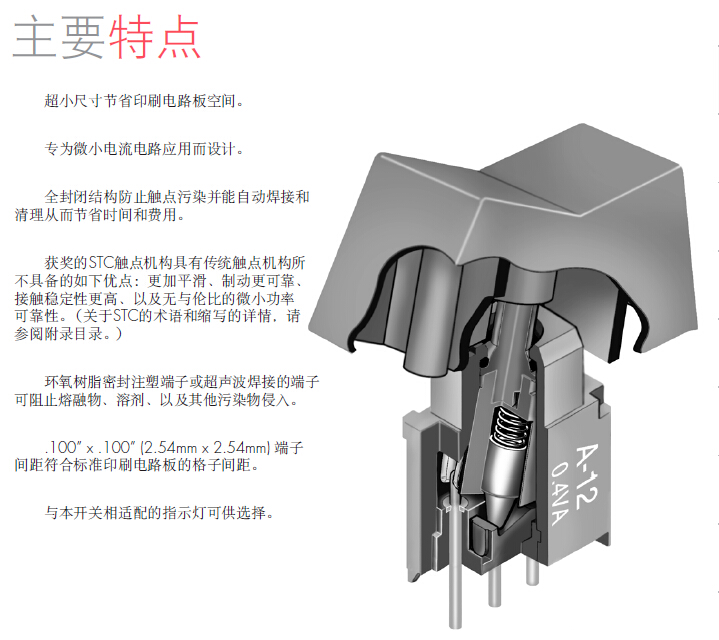 超小尺寸节省印刷电路板空间; 专为微小电流电路应用而设计; 全封闭结构防止触点污染并能自动焊接和清理从而节省时间和费用; 触点结构更加平滑,制动更可靠,接触稳定性更高,以及无与伦比的微小功率可靠性,环氧树脂密封注塑端子或超声波焊接的端子可阻止熔融物、溶剂,以及其他污染物侵入;