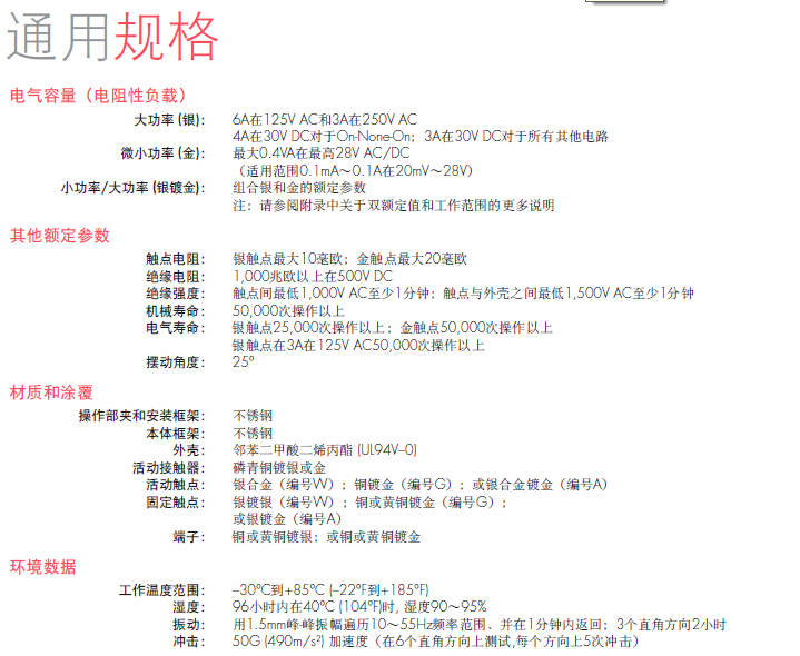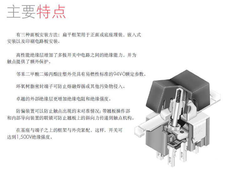 有三种面板安装方法:扁平框架用于正面或底座埋装,嵌入式安装以及印刷电路板安装; 高性能绝缘层增加了多开关中路之间的绝缘能力,并未触点提供了额外保护;