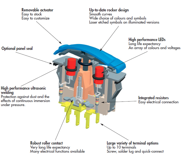 独特的开关设计,多种颜色选择; 激光蚀刻标志,带灯或不带灯; 可选密封等级IP68;