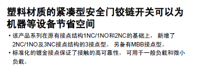 塑料材质的紧凑型安全门铰链开关可以为机器等设备节省空间; 在原有接点结构1NC/1NO和2NC的基础上,新增了2NC/1NO及3NC接点结构的3接点型; 另备有MBB接点型.标准化的镀金接点保证了接触的高可靠性; 可用于一般负载和微小负载;