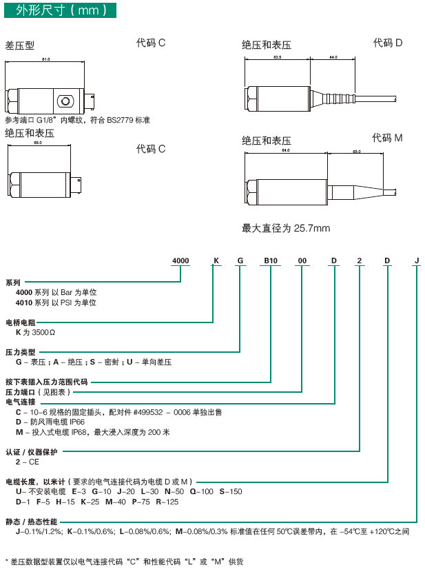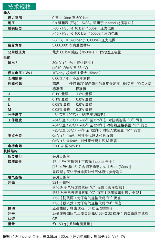 表压、密封、绝压和差压型; 超常稳定性和其他性能参数; 投入式、通用型和防风雨外壳等多种外壳; 使用溅射传感元件,稳定性高; 适用于条件恶劣需要进行长期精确实验室类测量的应用场合.