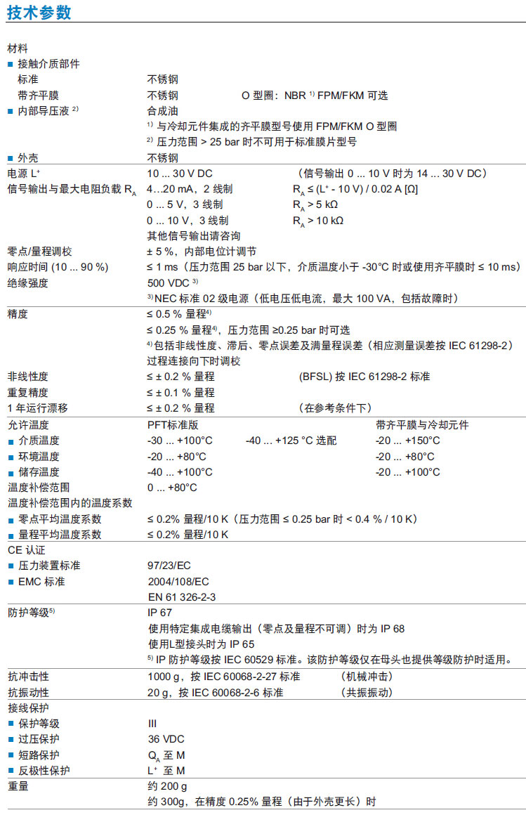 应用范围广泛; 在整个宽温范围内精度高; 配置多样可满足客户各种需求; 无活动部件:无机械磨损、抗疲劳、免维护; 密封不锈钢膜,耐腐蚀性介质; 安装快速简单.