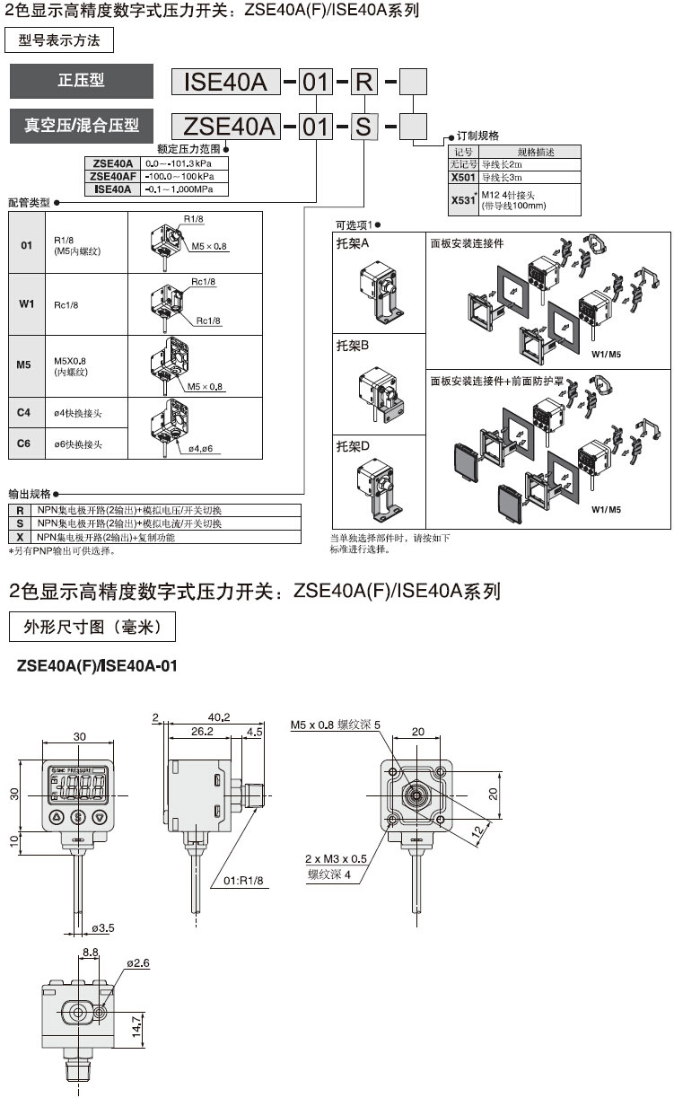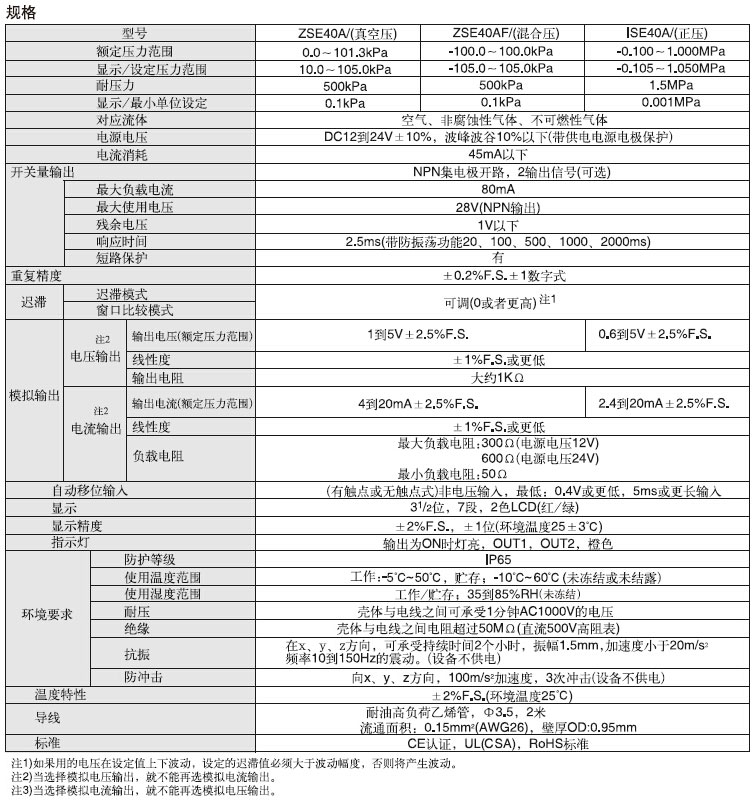 对应流体:空气、非腐蚀性气体、不可燃性气体; 安全防护等级IP65; 复制功能:开关设定最大10台同时复制; 2色显示; 简单设定(3步操作); 追加模拟电流输出; 丰富的配管变化及多种安装方式可选择; MPa﹤=﹥kPa追加切换功能; 对应CE,UL/CSA,RoHS标准; 省电功能.