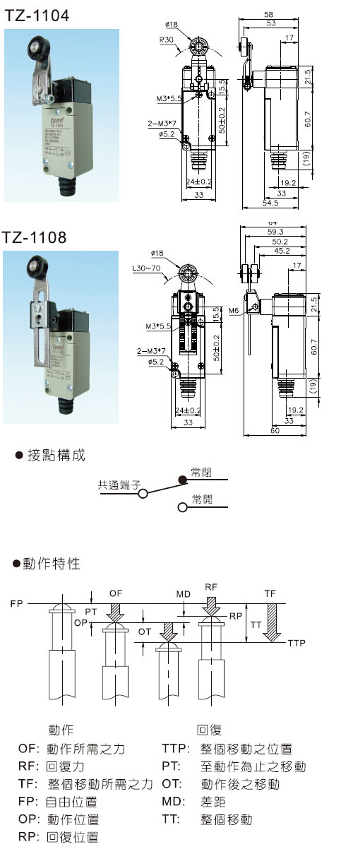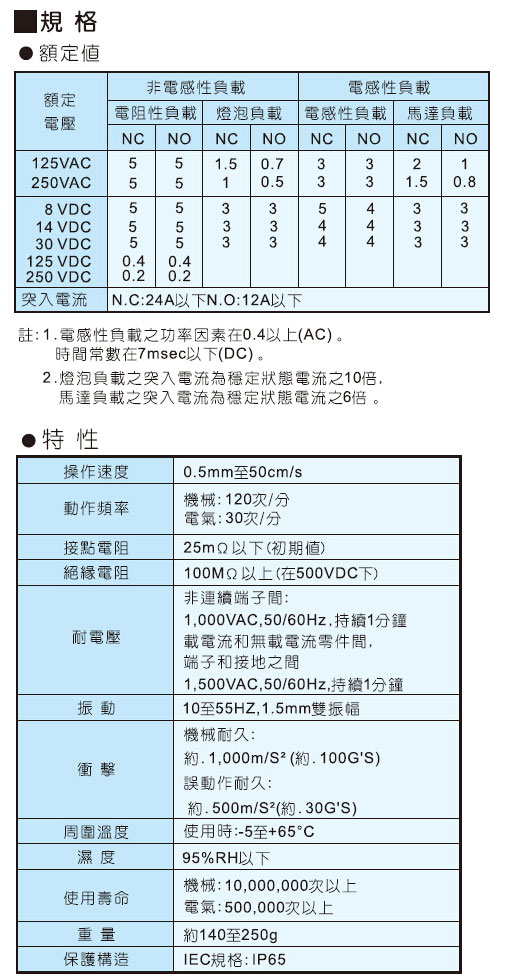 双回路型限动开关; 结构坚固,由锌合金及强化塑胶组成; 体积小,可防水、防油 ; 内藏微动开关有双簧片结构,机械寿命更长; 具较大之OT动作; 容易配线之导管设计.