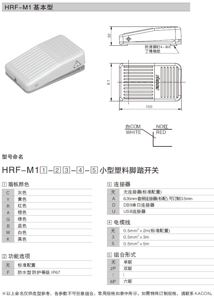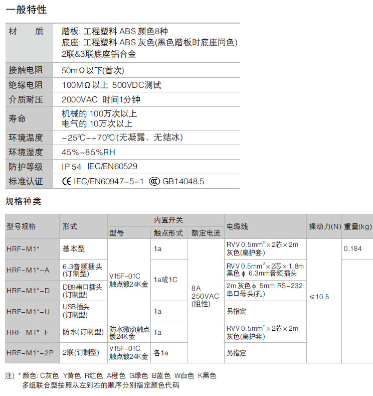 体积小巧外形美观,性价比高,适合各种机器设备控制用; 采用阻燃工程塑料ABS制造,机构强度高,耐冲击、耐磨损; 可选择多达8种颜色,灰色、黄色、红色、橙色、绿色、蓝色、白色、黑色; 内置V15F-01C瞬动型微动开关,获得UL、C-CL、VDE、CE认证,触点镀24K金处理,负载容量大,接触可靠性高; 标准配置RVV 0.5mm²×2芯×2m电缆线.