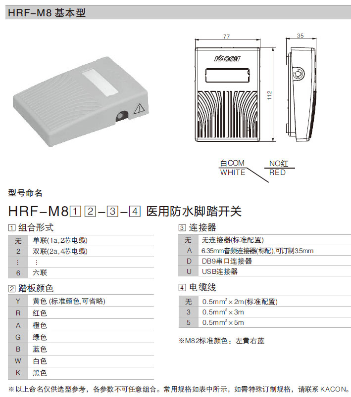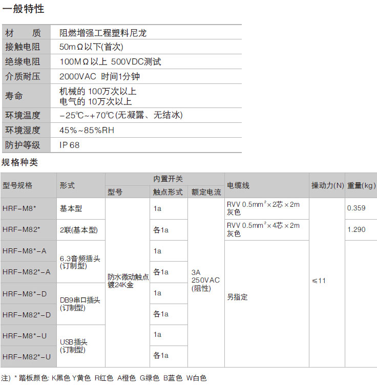 采用阻燃增强工程塑料塑料外壳,结构强度高、耐化学品、耐老化、耐冲击; 内置有内嵌式标记板、用途功能代号可方便标记且不易脱落和失色; 长时间操作无疲劳的后踏式构造; 防水、防油、防尘等级达到IP68,符合IEC/En60529标准; 标准配置RVV 0.5mm²×2芯×2m电缆线.