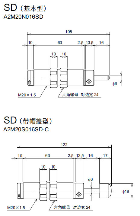 A2M20系列外形小、重量轻的模拟调节式螺纹型缓冲器(调节式/多节流孔/模拟调节式)