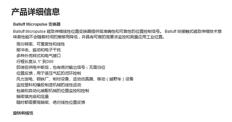 ·高分辨率、可重复性和线性·耐冲击、振动和电子干扰·多种外壳样式和电气接口·行程长度从1"到300·即使喜爱供电中断后,也有绝对输出信号,无需归位·位置反馈,用于液压气缸的闭环控制·风力发电、钢铁厂、制材设备、运动仿真器、移动(越野车)设备·监控塑料盒橡胶制造机械的线性运动·包装和自动化装配机械的位置监控和控制·精密填充级和定量·随时都需要高精度、绝对线性位置反馈