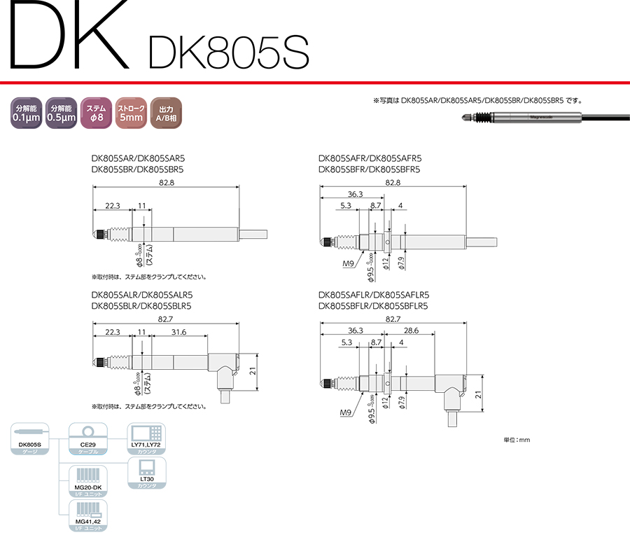 DK805SBFR5,DK805SBFLR5,精度0.001mm;分辨率0.1微米,测量长度5mm;线缆最长可达22m;安装容易,设计坚固,适用于各种工厂作业环境,耐油水灰尘,抗震动冲击能力强;