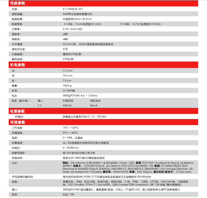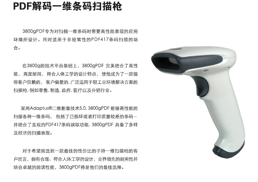 3800gPDF专为对扫描一维条码时需要高性能表现的应用环境所设计.其完美结合了高性能的扫描各种一维条码,包括了已损坏或者打印质量较差的条码结合的PDF417条码读取功能,3800gPDF具备了多样及经济的扫描表现.