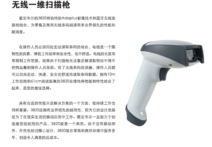 3820将独特的Adaptus影像技术和蓝牙无线连接相结合,为零售商及商用无线条码阅读带来业界领先的性能和耐用度.有了无线条码阅读器,操作人员就可以自由走动,快速、安全而舒适的读取条码数据,拥有10m工作范围和61cm阅读距离.