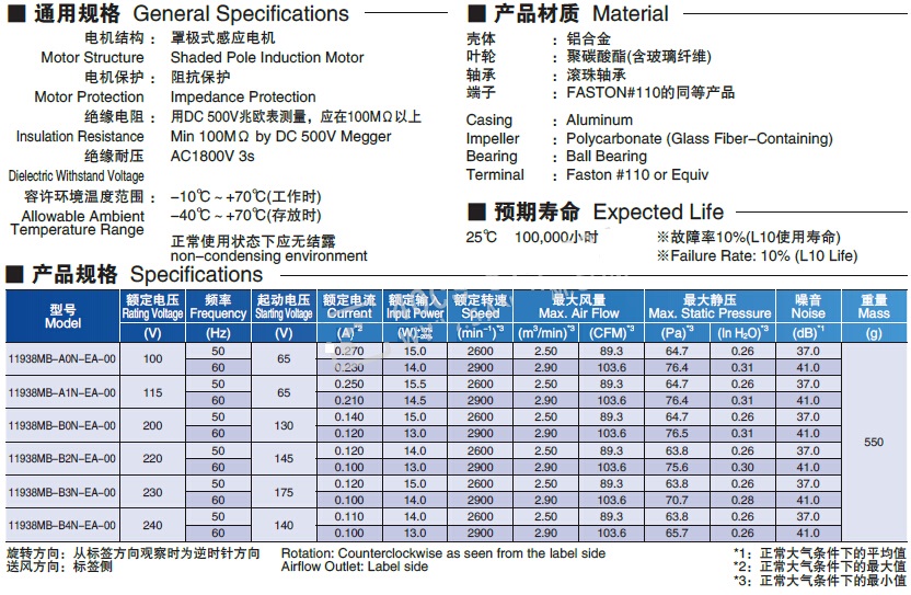 罩极式感应电机;阻抗保护;铝合金壳,滚珠轴承;环境温度正常使用状态下应无结露