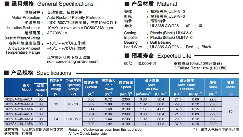 205418/08025SA-12L-AA-00/08025SA系列 滚珠轴承型直流风扇电机