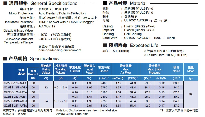 205462/09225SS-12N-EA-00/09225SS系列 含油轴承型 直流风扇电机