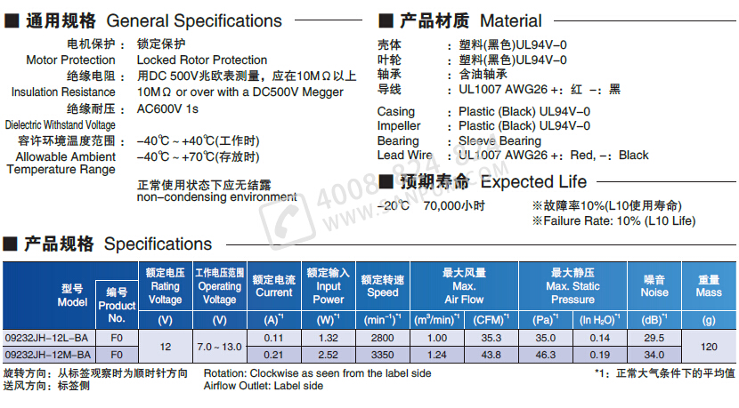 205473/09232JH-12M-BA-F0/09232JH系列 含油轴承型直流风扇电机