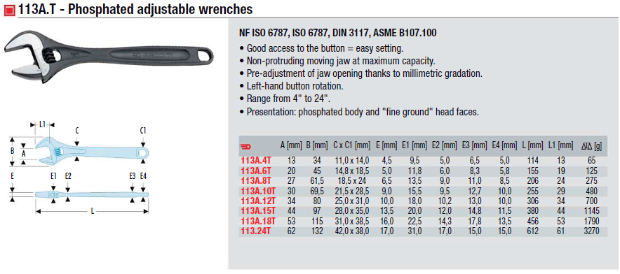 ISO 6787,DIN 3117,NF 374-324-ASME B107.8M标准.把手轮廓确保使用简易.旋转螺纹更顺畅.钳口坡度设计,增加可及性.颚部移至最大处无突出.毫米刻度,可预调整颚部开口.左边旋转,尺寸:4-24.发黑主体,光滑开口,头部抛光表面.