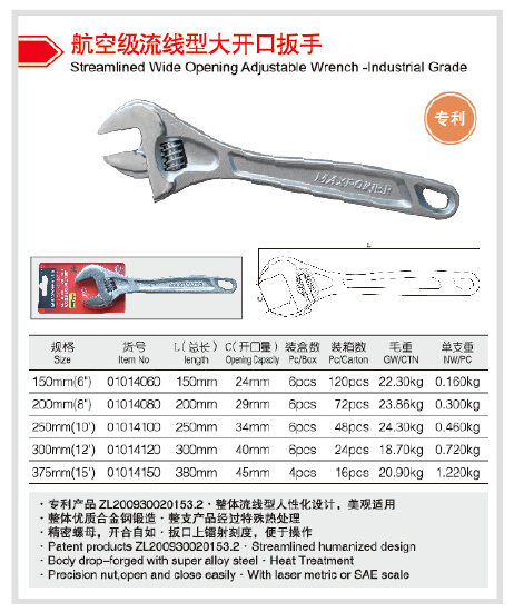 专利产品ZL200930020153.2,整体流线型人性化设计你,美观适用.整体优质合金钢锻造,整支产品经过特殊热处理,精密螺母,开口自如,扳口镭射刻度,便于操作.