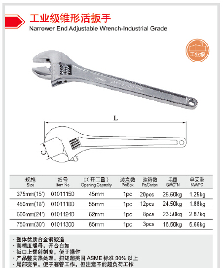 整体优质合金钢锻造,高精度螺母,开合自如,扳口上镭射刻度,便于操作.整支热处理,扭矩超美国ASME标准30%以上,尾部变窄,便于套管工作,但注意不能超负荷工作.