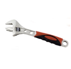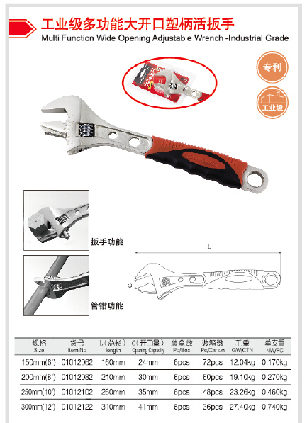 专利产品ZL03313667.X,多功能大开口扳手,双材料胶柄,握感舒适,整体优质合钢金锻造,高精度螺母,开合自如.扳口上镭射刻度,便于操作.尾部梅花孔,可替代同规格的梅花扳手.