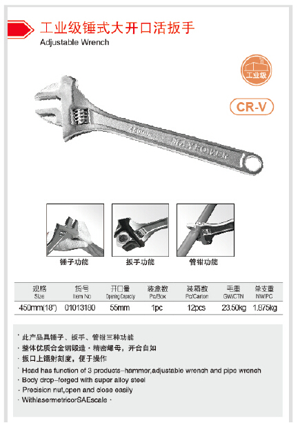 此产品具锤子、扳手、管钳三种功能,整体优质合金钢锻造,精密螺母,开合自如,扳口镭射刻度,便于操作.
